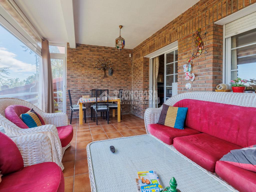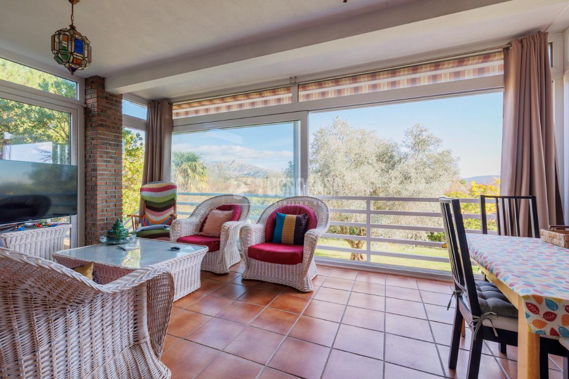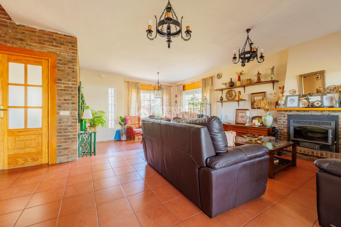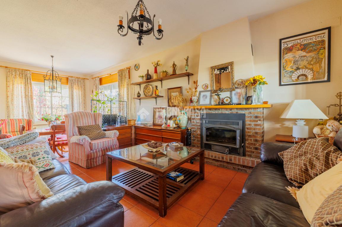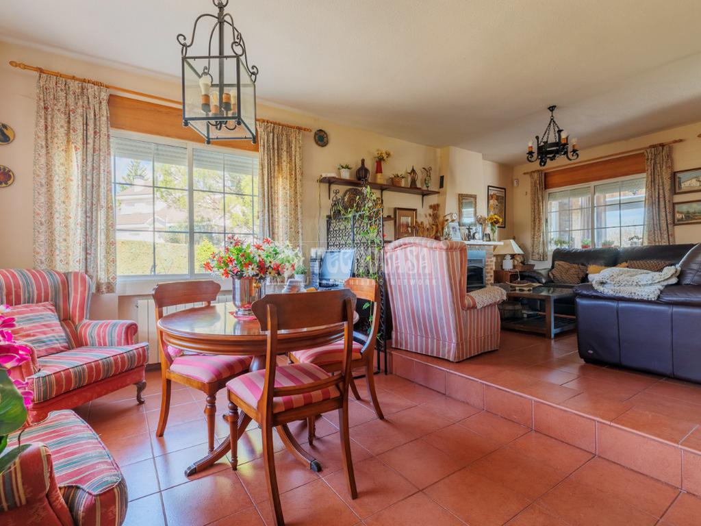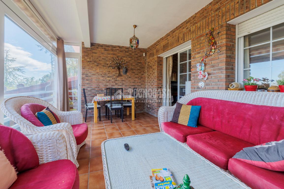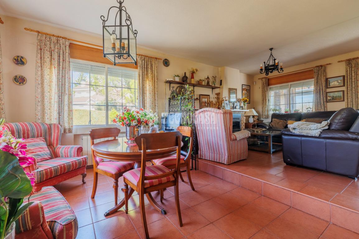 La casa se desarrolla prácticamente en una única planta, a la que se accede tanto desde el garaje como por una escalera exterior desde la fachada principal. Al entrar, nos recibe un gran salón comedor abierto y luminoso, con diferentes ambientes. La zona de estar, con chimenea de casette y sofás, se diferencia por un pequeño desnivel respecto a la zona de comedor, lo que aporta dinamismo y amplitud al conjunto. Desde aquí se accede a una terraza acristalada espectacular, completamente reformada, con ventanales de alta calidad y vistas panorámicas a la Sierra de Guadarrama. Este espacio, uno de los grandes atractivos de la vivienda, conecta además con el jardín trasero a través de una puerta acristalada y unas escaleras exteriores.