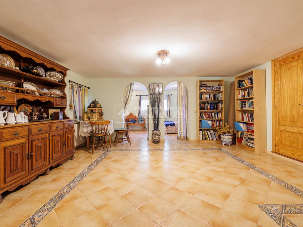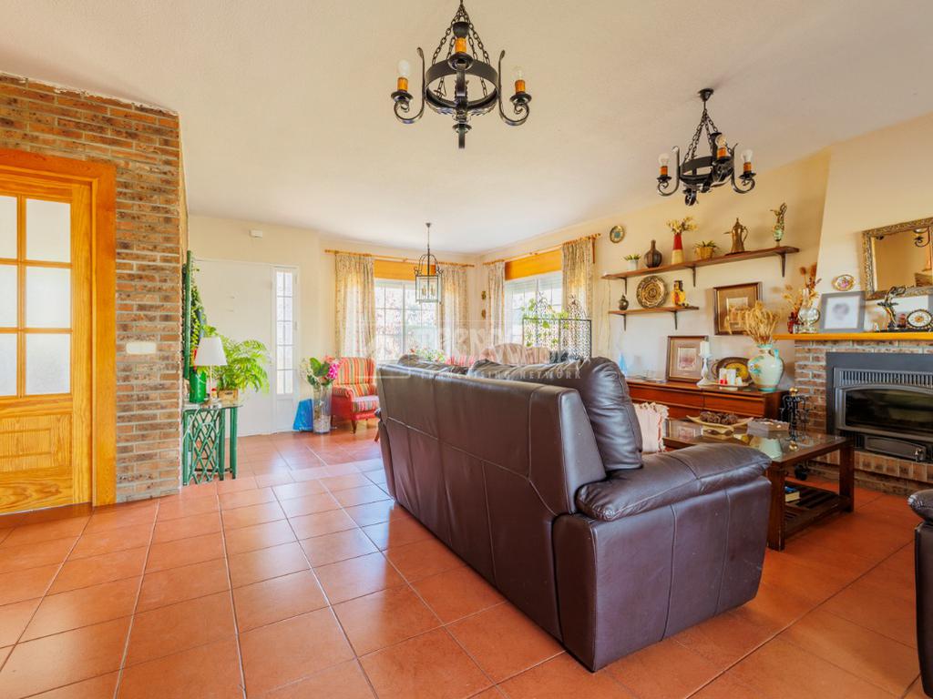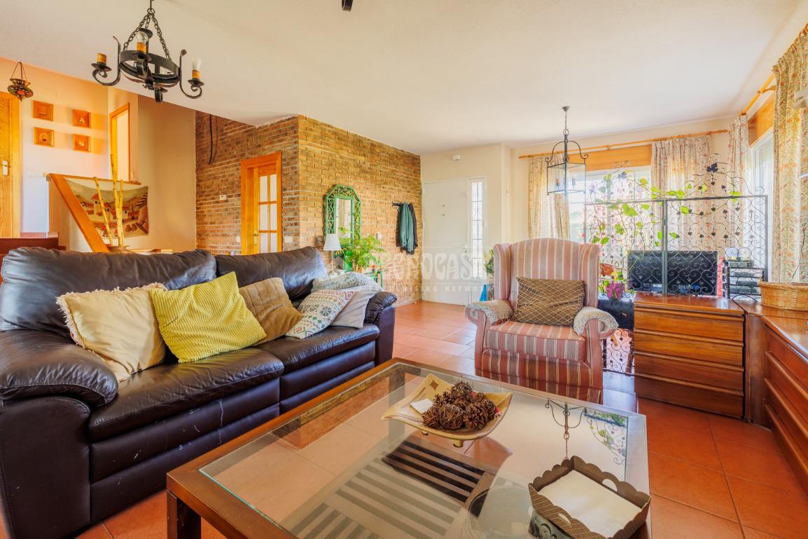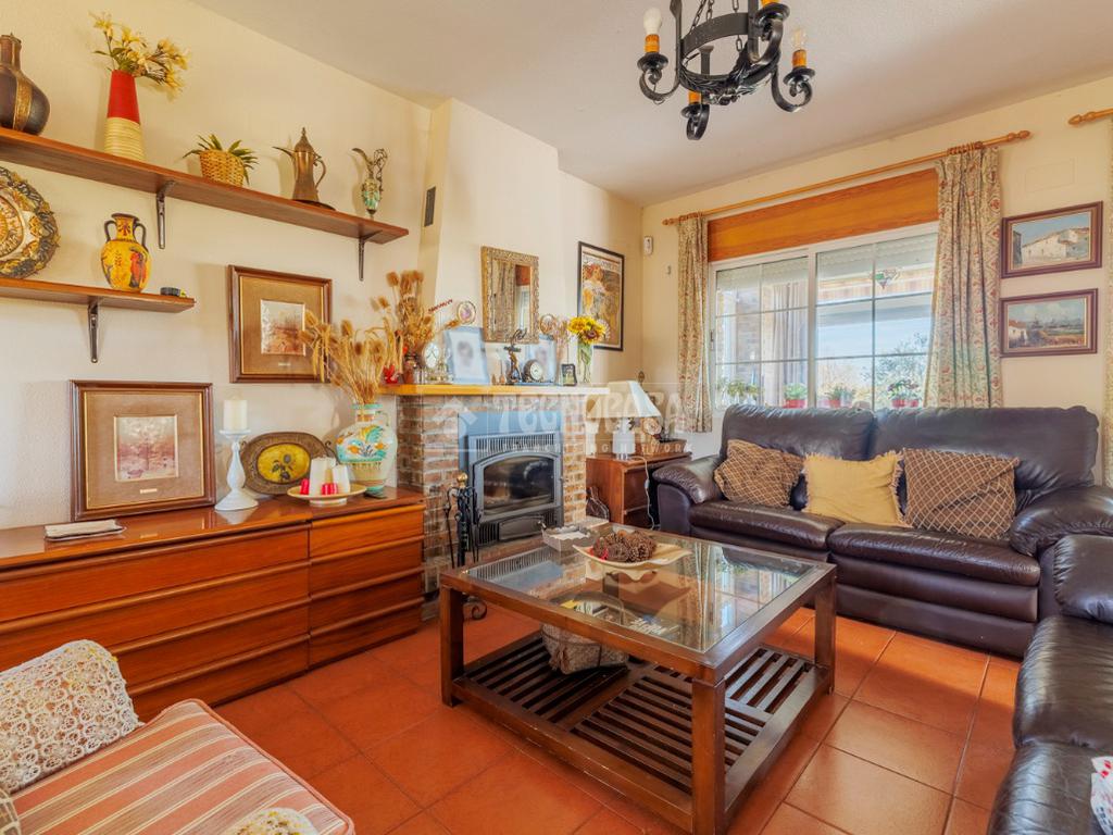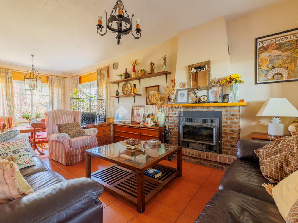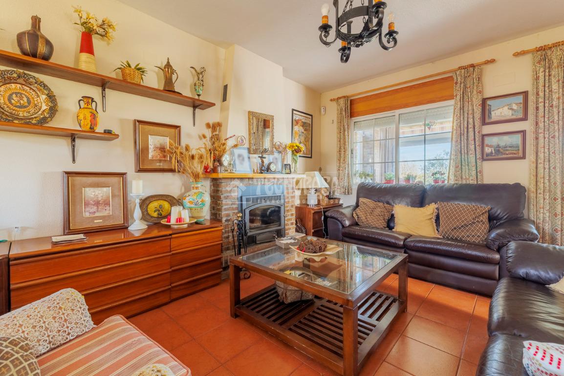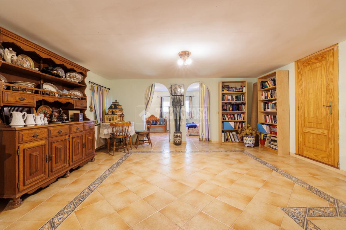 La casa se desarrolla prácticamente en una única planta, a la que se accede tanto desde el garaje como por una escalera exterior desde la fachada principal. Al entrar, nos recibe un gran salón comedor abierto y luminoso, con diferentes ambientes. La zona de estar, con chimenea de casette y sofás, se diferencia por un pequeño desnivel respecto a la zona de comedor, lo que aporta dinamismo y amplitud al conjunto. Desde aquí se accede a una terraza acristalada espectacular, completamente reformada, con ventanales de alta calidad y vistas panorámicas a la Sierra de Guadarrama. Este espacio, uno de los grandes atractivos de la vivienda, conecta además con el jardín trasero a través de una puerta acristalada y unas escaleras exteriores.