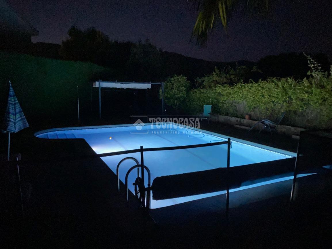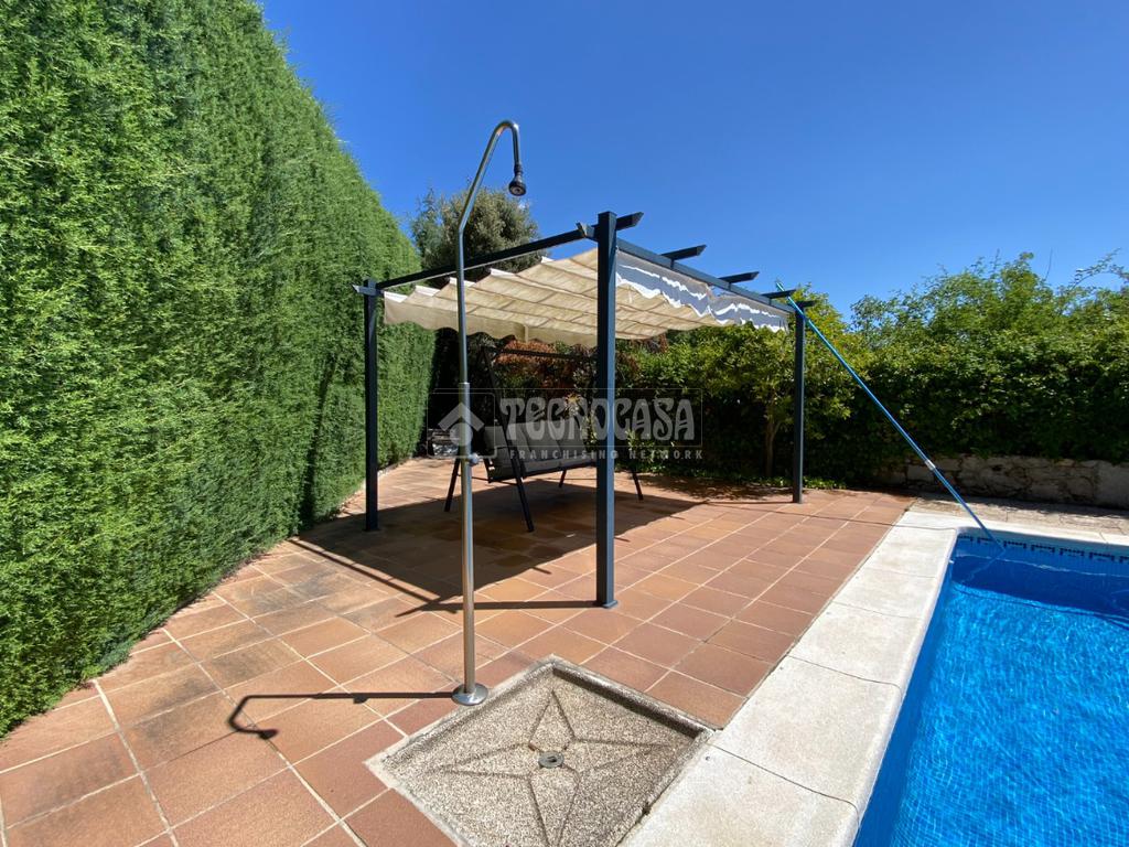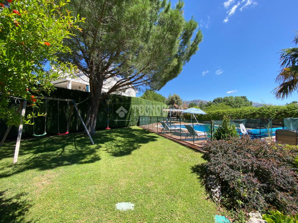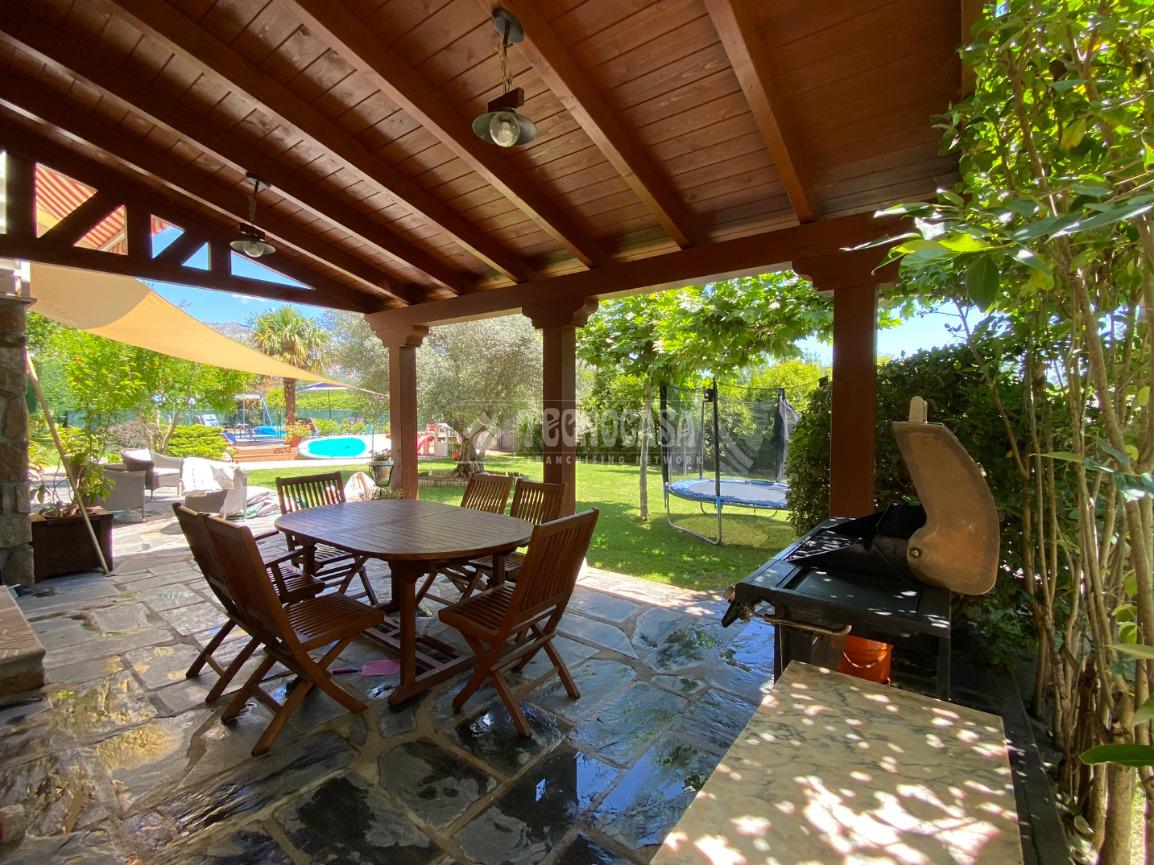 El exterior de la casa es realmente encantador: el jardín se distribuye de forma equilibrada entre zonas verdes y áreas pavimentadas, e incluye una piscina de unos 40 m2 con depuradora recientemente cambiada, una amplia zona de solárium y, justo debajo de la terraza, un porche de madera con barbacoa.