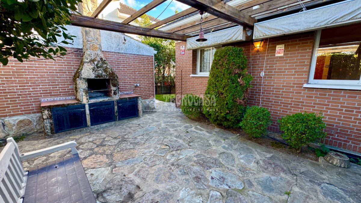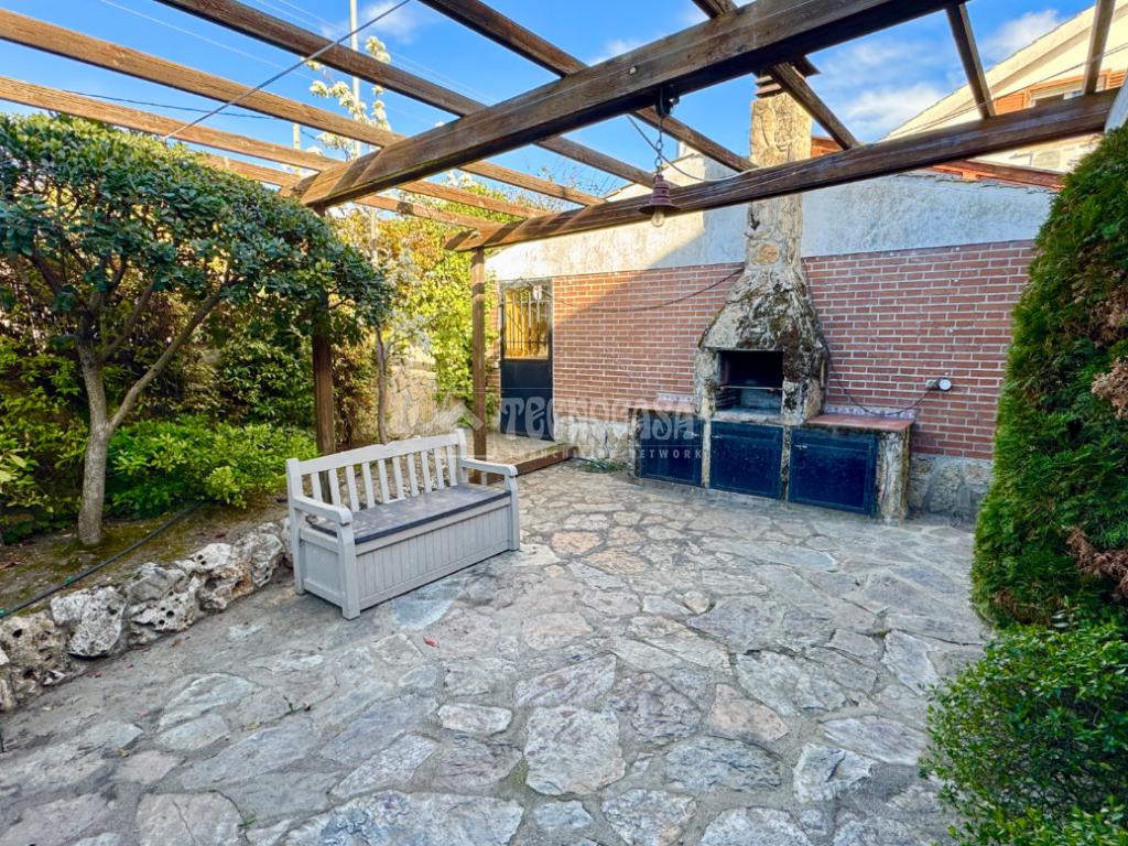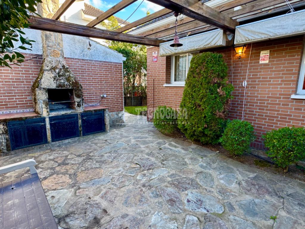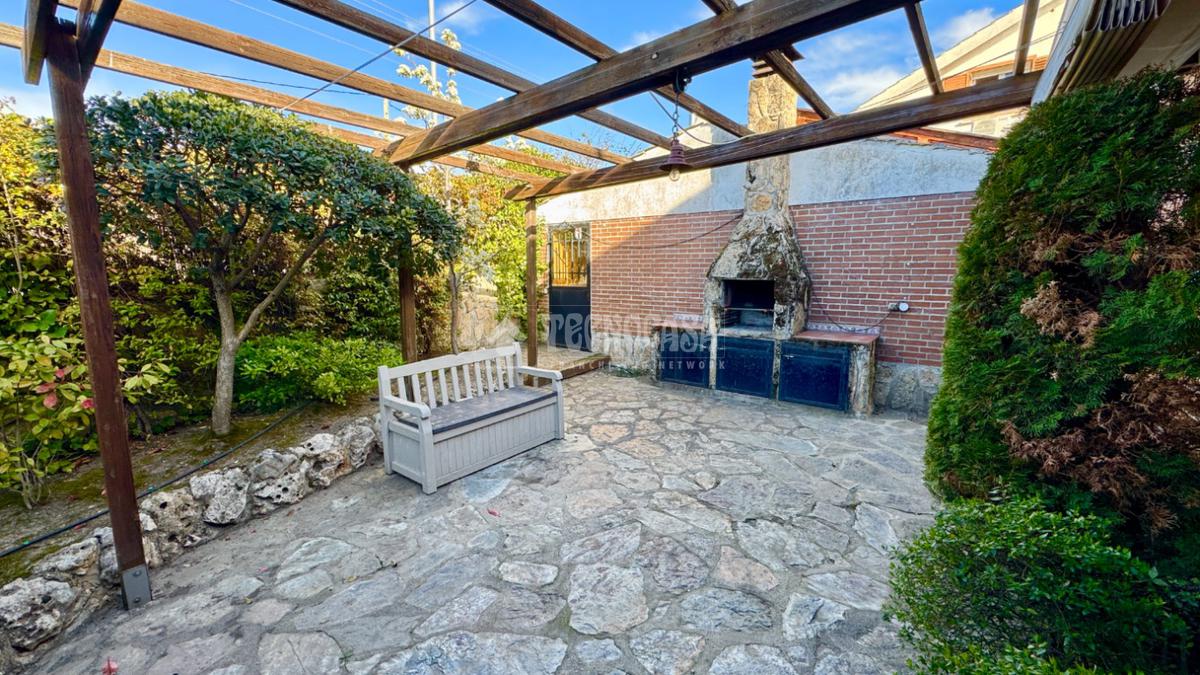 En el exterior, la parcela está pensada para disfrutar: jardín delantero, garaje acondicionado y revestido en madera, y un agradable patio trasero con pérgola con toldos y zona de barbacoa, ideal para reuniones y momentos de ocio.